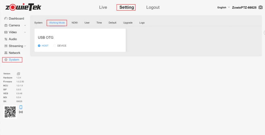 Please log in to the web console interface, click Setting->System->Working Mode, and switch the USB mode.