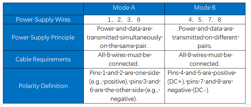 The IEEE 802.3af/at standard defines two PoE power supply methods: Mode A and Mode B. The main difference lies in which wires in the Ethernet cable are used to transmit power.