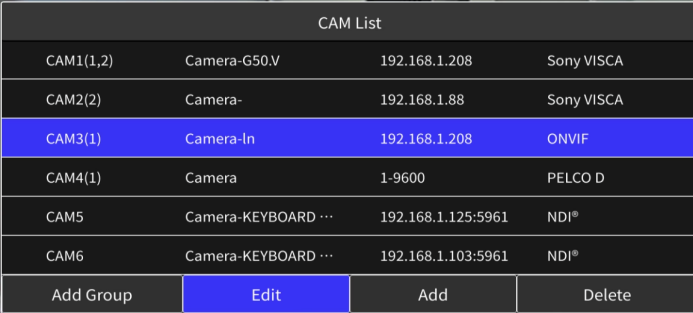 2.Use the up, down, and top button of the joystick to move the cursor and select the camera to be modified.