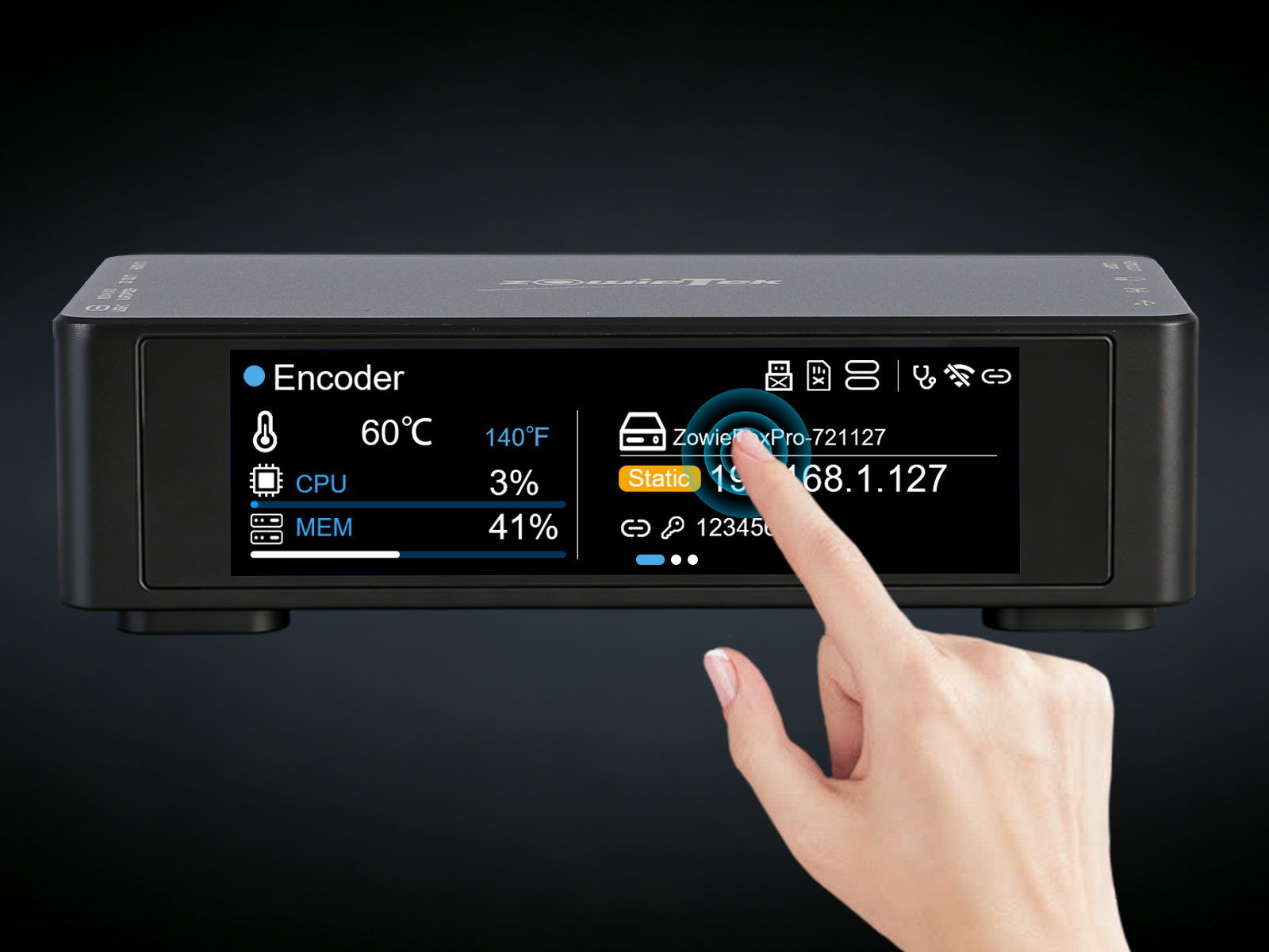 No laptop required for on-site deployment. The integrated LCD Touchscreen allows for full device configuration, network settings, and status monitoring. Adjust NDI parameters or switch modes with a single tap on the hardware.